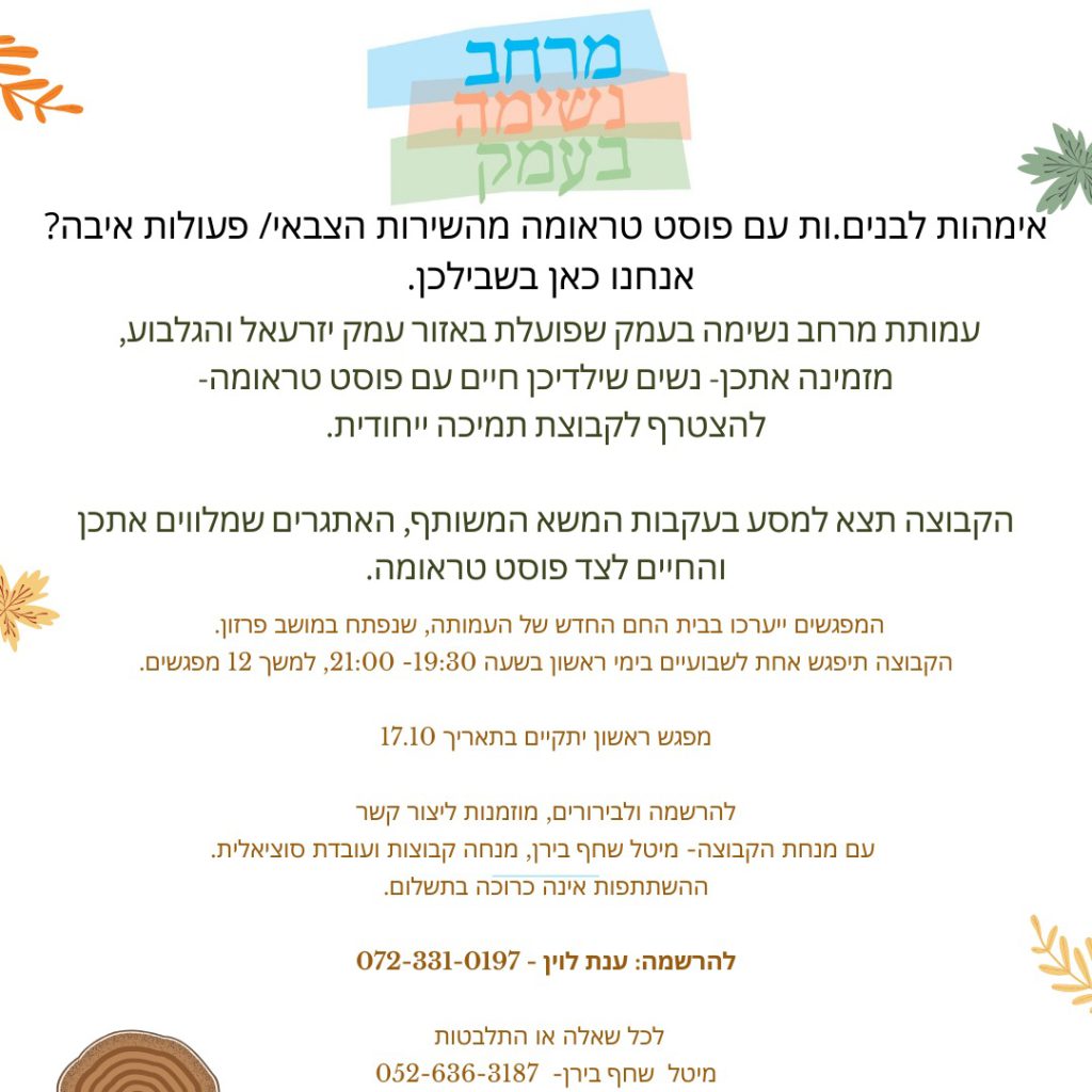 מפגשי אמהות במרחב נשימה אמהות לבנים.ות עם פוסט טראומה – אנחנו כאן בשבילכן עמותת "מרחב נשימה בעמק" מזמינה אתכן פרטים נוספים »